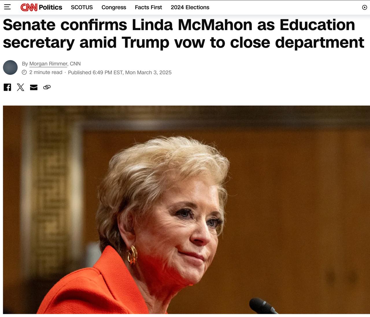 Сенат США затвердив кандидатуру Лінди Макмен на посаду міністра освіти. За неї віддав голоси 51 сенатор, 45 висловилися проти.