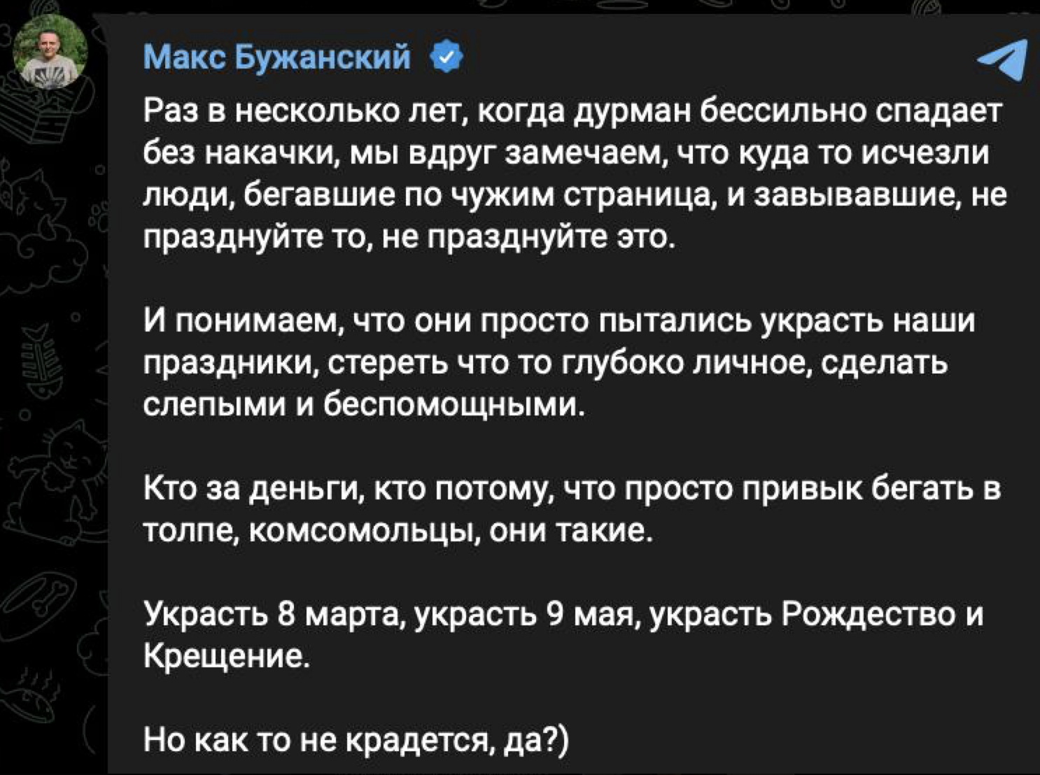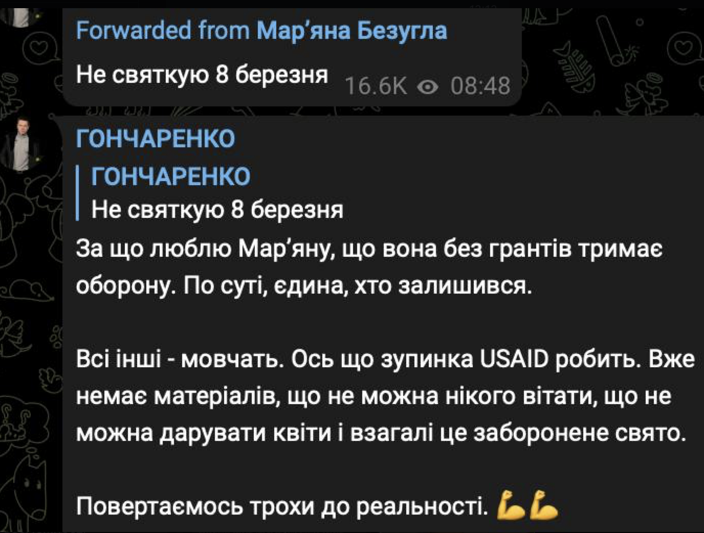 "Ось що робить зупинка USAID. Вже немає матеріалів про те, що не можна нікого вітати, що не можна дарувати квіти та взагалі, що це заборонене свято", - написав він.