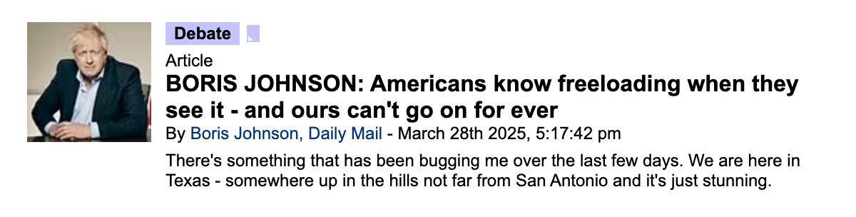 "Оборонний бюджет США складає трильйон доларів на рік, що більш ніж у 12 разів перевищує оборонний бюджет Великобританії, хоча населення США всього в п'ять разів перевищує наше. США виділяють близько 3,5% свого ВВП на оборону, тоді як Великобританія витрачає близько 2,3%", - пише Джонсон.