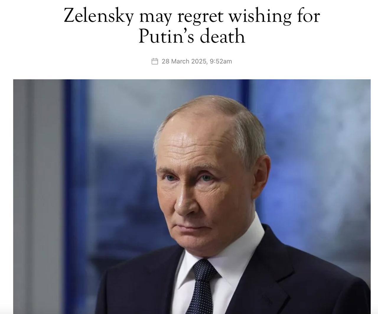 Президент України Володимир Зеленський може пошкодувати щодо бажання смерті лідеру РФ Володимиру Путіну.