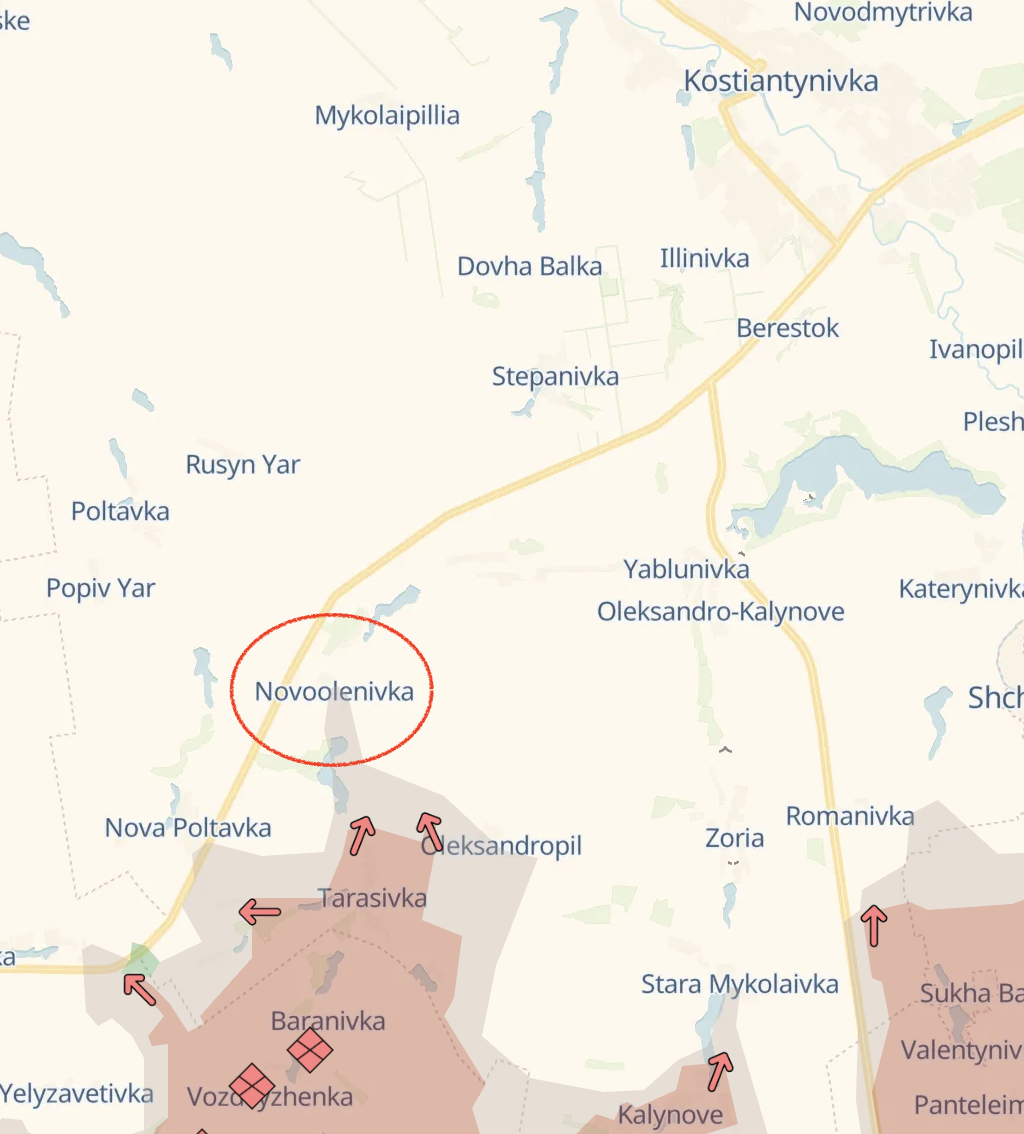 Росіяни захопили Новоєленівку на південь від Костянтинівки, повідомив український військовий із позивним "Мучною". Це село поряд із трасою до Костянтинівки з Покровська.