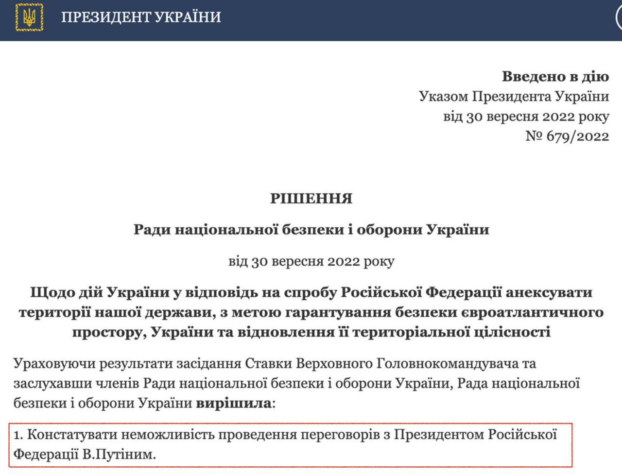 Але є й суто формальні питання щодо заяви українського президента. Це його власний указ від 30 вересня 2022 року, яким заборонено переговори особисто із Путіним.