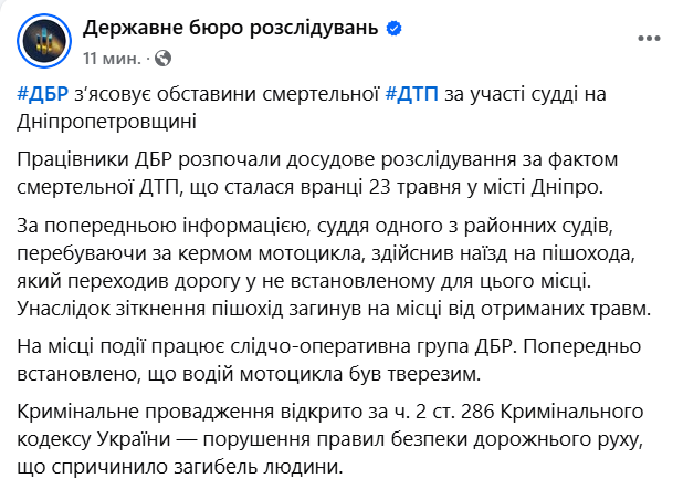 За попередньою інформацією, суддя одного з районних судів, перебуваючи за кермом мотоцикла, скоїв наїзд на пішохода, який переходив дорогу у невстановленому для цього місці. Внаслідок зіткнення пішохід загинув на місці від отриманих травм.