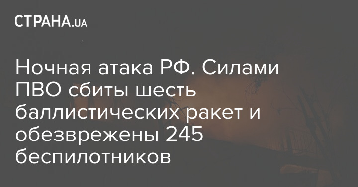 Станом на ранок протиповітряною обороною збито 6 балістичних ракет Іскандер-М/KN-23 (Київ) та знешкоджено 245 ворожих БПЛА типу на сході, півночі, півдні та в центрі країни.