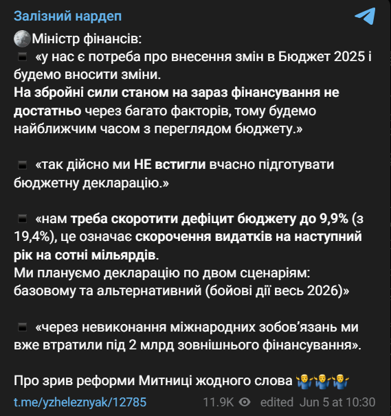 При цьому Железняк не пише, чи міністр уточнив обсяг дефіциту і запропоновані способи його компенсації.