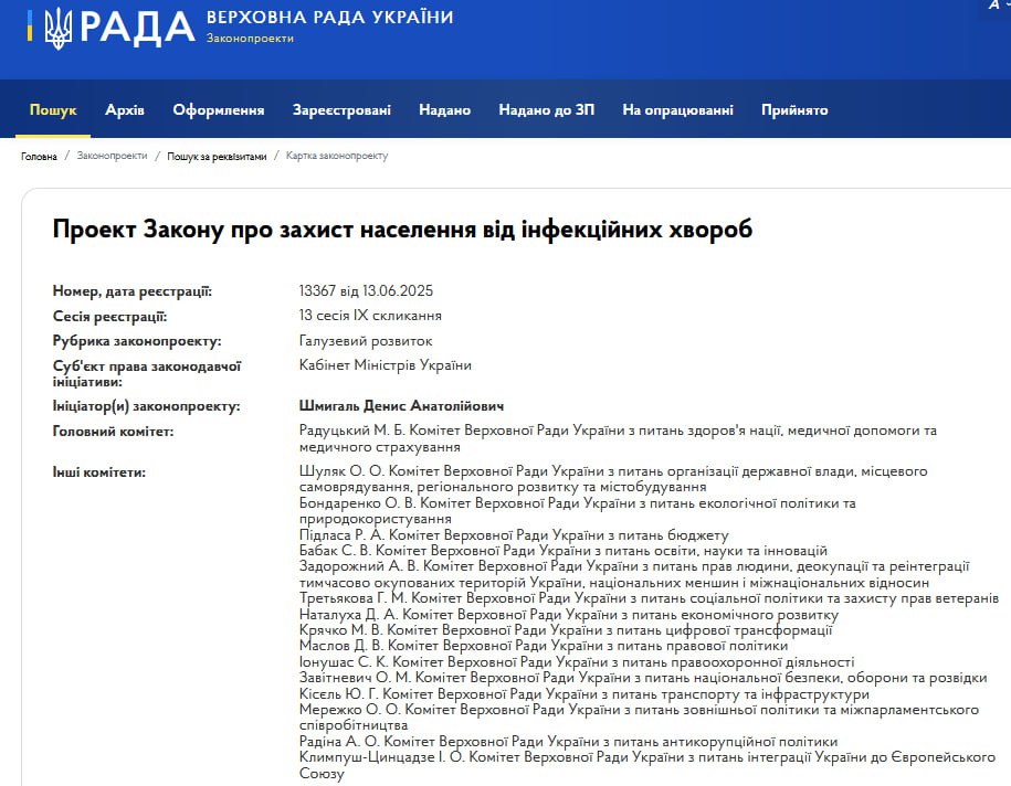 Проект за №13367 називається "Про захист населення від інфекційних захворювань". Його ініціатором виступив прем'єр-міністр Денис Шмигаль.