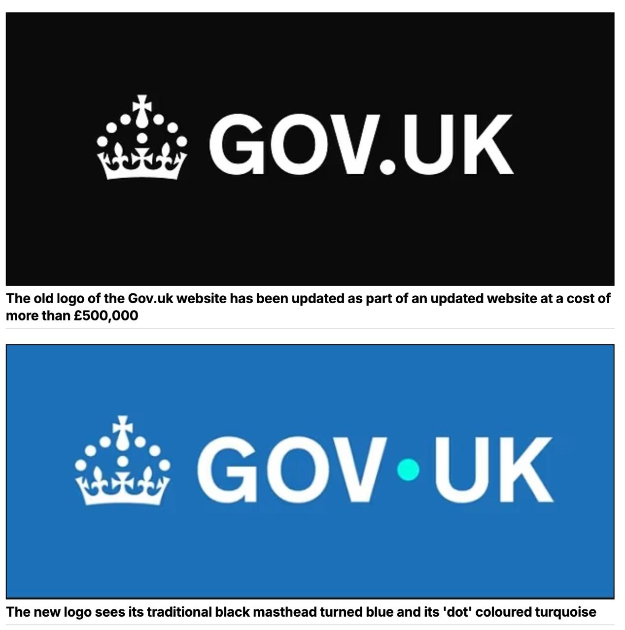 Влада Великобританії витратила 532 000 фунтів стерлінгів на мінімальний редизайн логотипу урядового сайту gov.uk. Чорний логотип зробили синім, а крапку - бірюзовою та розмістили трохи вище, ніж на старому варіанті.