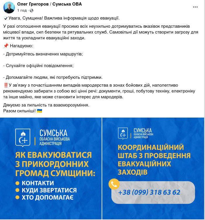 "Офіційно заявляємо: така інформація не відповідає дійсності. Подібна публікація не з'являлася ні на офіційних сторінках начальника ОДА Олега Григорова, ні на ресурсах Сумської обласної військової адміністрації. Це чергове інформаційне вкидання ворога, спрямоване на посилення паніки, дестабілізацію прикордонного регіону та підрив довіри до влади".