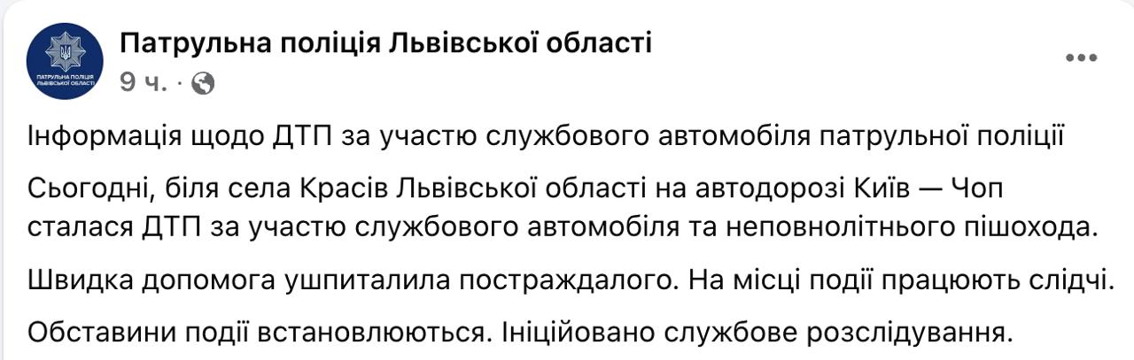 "Сьогодні біля села Красів Львівської області на автодорозі Київ - Чоп сталася ДТП за участю службового автомобіля та неповнолітнього пішохода. Швидка допомога ушпиталила постраждалого. На місці події працюють слідчі", - йдеться у повідомленні.