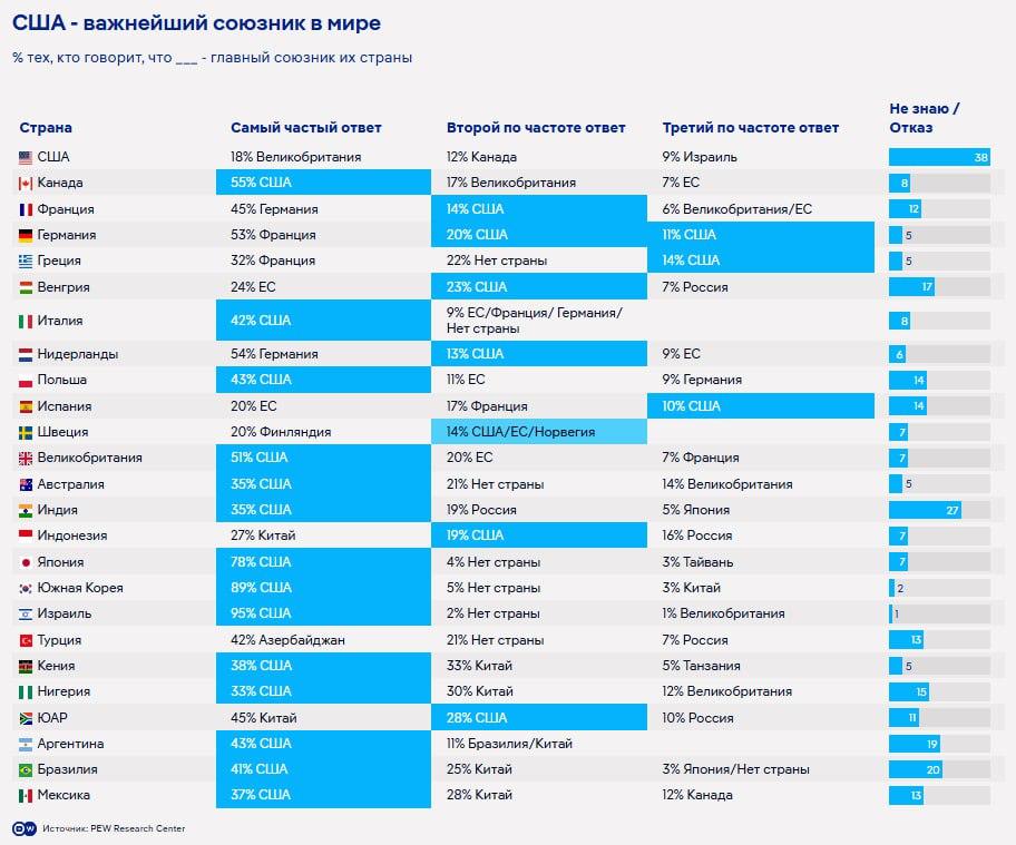 При цьому ніхто з мешканців країн, які брали участь у опитуванні, не назвав Україну союзником. Найважливішим союзником у світі респонденти різних країн найчастіше називали США, Німеччину, Францію та Китай.