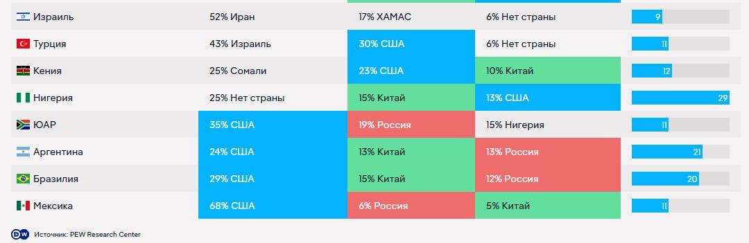 Загалом по всьому світу найчастіше називають загрозою три країни: США, Росію та Китай. У Європі майже всі країни вважають головною загрозою Росію, крім Іспанії, де основною загрозою вважають США, та Греції, де на першому місці перебуває Туреччина.
