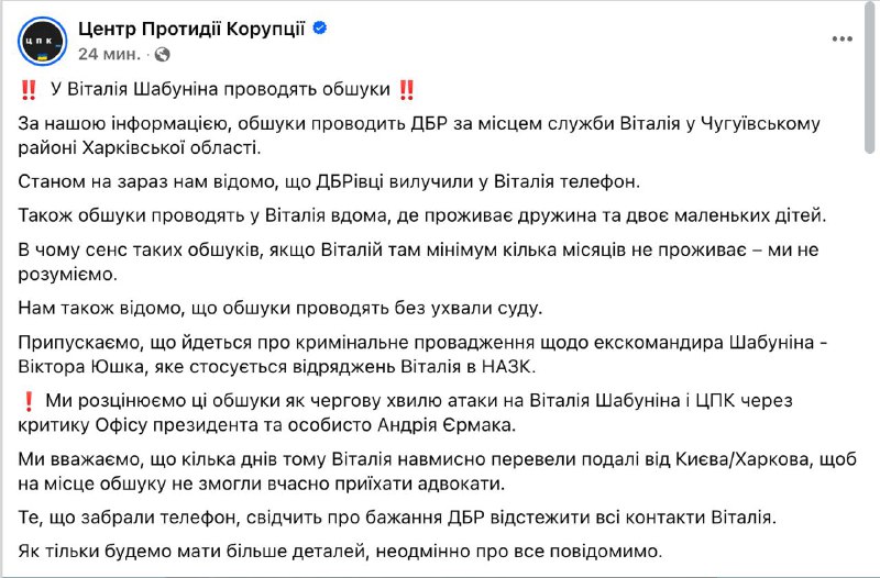 Державне бюро розслідувань проводить обшуки у голови Центру протидії корупції Віталія Шабуніна. Слідчі дії йдуть нібито без рішення суду у військовій частині в Чугуєві Харківської області, куди його нещодавно перевели, а також у нього вдома, де знаходяться дружина та двоє дітей Шабуніна.