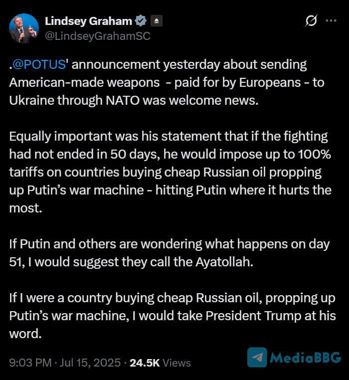 "Заява Трампа вчора про постачання зброї американського виробництва – сплаченої європейцями – Україні через НАТО була сприйнята з натхненням. Не менш важливою стала його заява про те, що якщо бойові дії не припиняться протягом 50 днів, він запровадить тарифи до 100% проти країн, що купують дешеву російську. Завдаючи удару по самому хворому місцю. Якщо Путін та інші задаються питанням, що відбудеться на 51-й день, я б порадив їм зателефонувати аятолі.