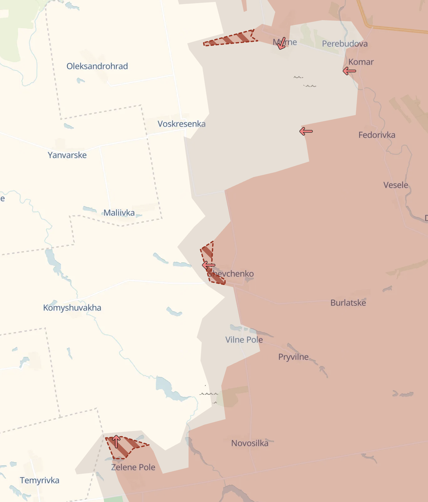 На південь, біля меж Дніпропетровської області, росіяни захопили село Шевченка, просунулися від Мирного у бік Олександрограда та біля Зеленого поля.