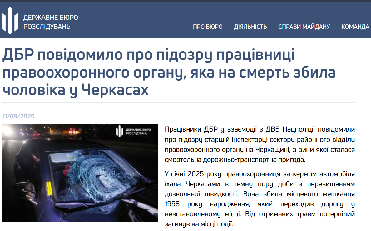 ДБР повідомило про підозру працівниці правоохоронного органу, яка ще в січні збила на смерть чоловіка у Черкасах