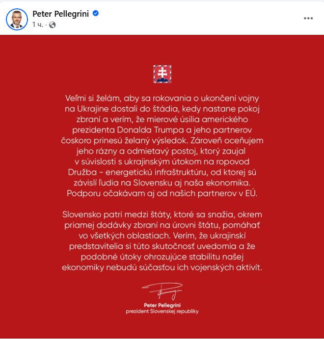 "Я ціную його тверду і негативну позицію, яку він зайняв у зв'язку з українським нападом на нафтопровід "Дружба" – енергетичну інфраструктуру, від якої залежать народ Словаччини і наша економіка. Я також чекаю підтримки від наших партнерів у ЄС... Я вірю, що українська влада усвідомлює цей факт, і що подібні напади не подібні до нападів діяльності”, – написав президент.