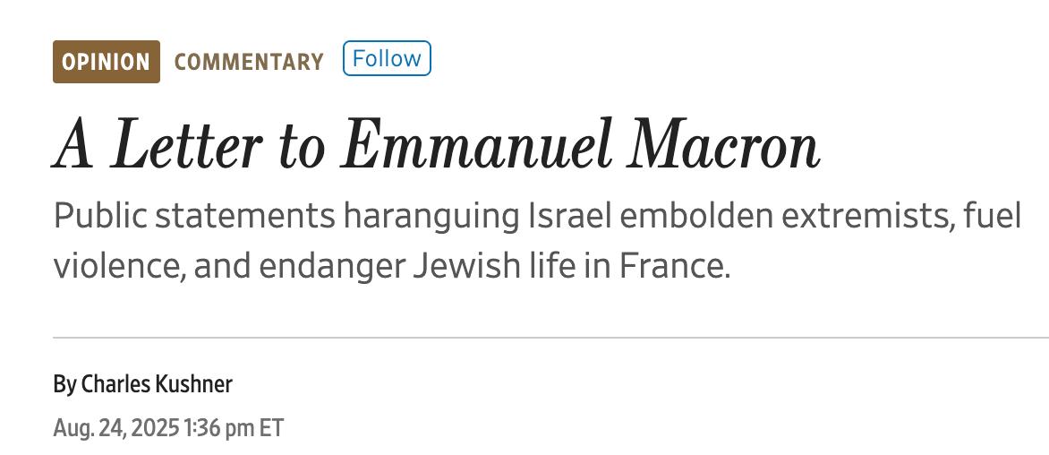 "У 81-у річницю звільнення Парижа союзниками, що поклав кінець депортації євреїв з французької землі, я висловлюю глибоке занепокоєння різким зростанням антисемітизму у Франції і відсутністю достатніх заходів з боку вашого уряду щодо протидії йому. синагоги або школи або щоб не були розгромлені підприємства, які належать євреям, Ваше Міністерство внутрішніх справ повідомило про антисемітські інциденти навіть у дитячих садках. це антисемітизм, простий та зрозумілий", - написав Кушнер.