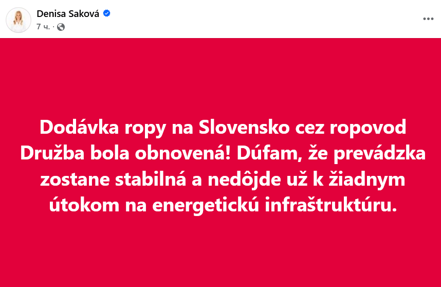 "Подання нафти до Словаччини трубопроводом "Дружба" відновлено! Сподіваюся, ситуація залишиться стабільною і більше не буде атак на енергетичну інфраструктуру", - йдеться у повідомленні міністра у Фейсбуці.