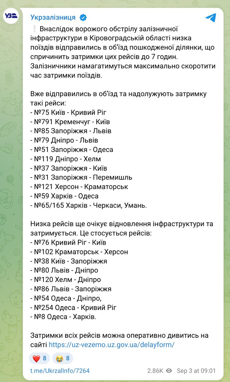 9.06 Затримки поїздів через удар по залізничній інфраструктурі на Кіровоградщині вже досягають 7 годин, повідомляє Укрзалізниця.