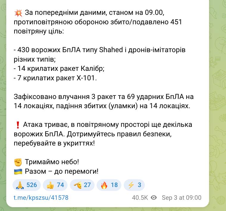 Зафіксовано попадання 3 ракет та 69 ударних БПЛА на 14 локаціях, уламки збитих ще на 14 локаціях.