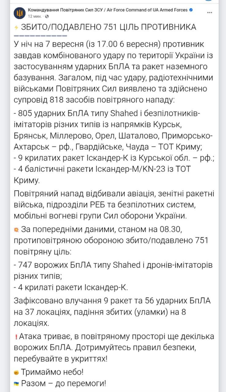 Україну вночі атакували 805 "Шахедів" та дронів-імітаторів (збито/придушено 747). Також було запущено 13 ракет: 9 крилатих "Іскандер-К" (збито 4) та 4 балістичні "Іскандер-М/KN-23" (усі досягли цілей).