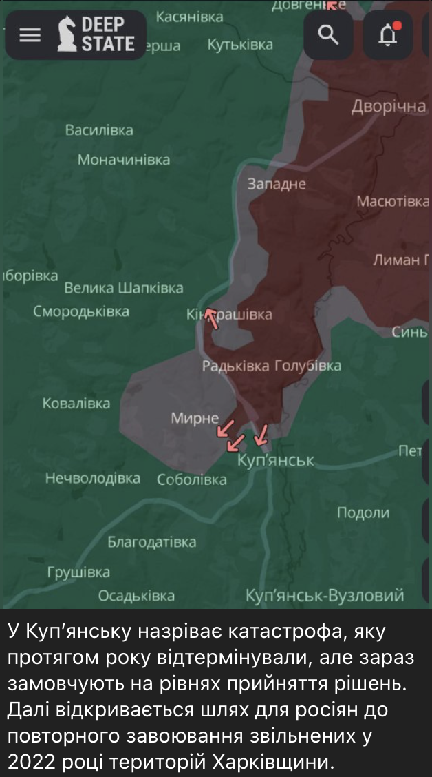 Раніше Deep State повідомляв, що армія РФ зайшла до Куп'янська. За деякими даними, бої тривають уже у центрі міста. Проте у Збройних силах України цей факт заперечили.