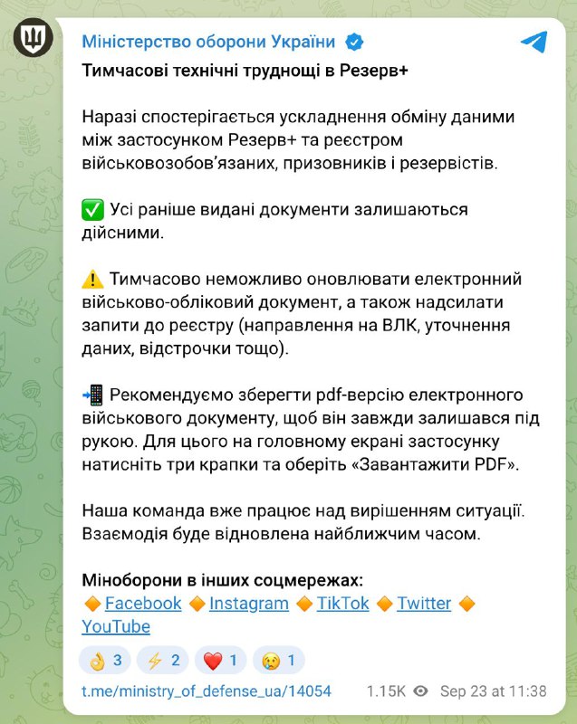 "Тимчасово неможливо оновлювати електронний військово-обліковий документ, а також надсилати запити до реєстру (надсилання на ВВК, уточнення даних, відстрочки тощо). Рекомендуємо зберегти pdf-версію електронного військового документа, щоб він завжди залишався під рукою", - пише відомство.