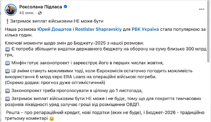 "Наш дедлайн продиктований необхідністю виплат військовим з 1 листопада. Після 1 листопада теж є (кошти у бюджеті – Ред. ), але недостатньо", - повідомила Підласа в інтерв'ю.