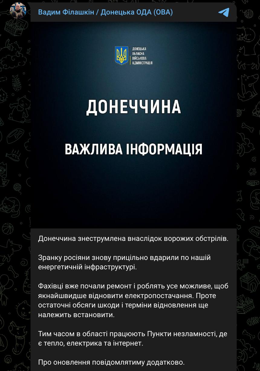 Сьогодні вранці, 12 жовтня, Росія завдала ударів по енергетичних об'єктах України, внаслідок чого Донецька область залишилася без електрики.