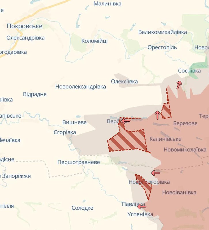 11.39 Армія РФ просунулась на Дніпропетровщині біля Вербового та Степового, а також південніше, біля Новогригорівки Запорізької області. Про це повідомляє Deep State.