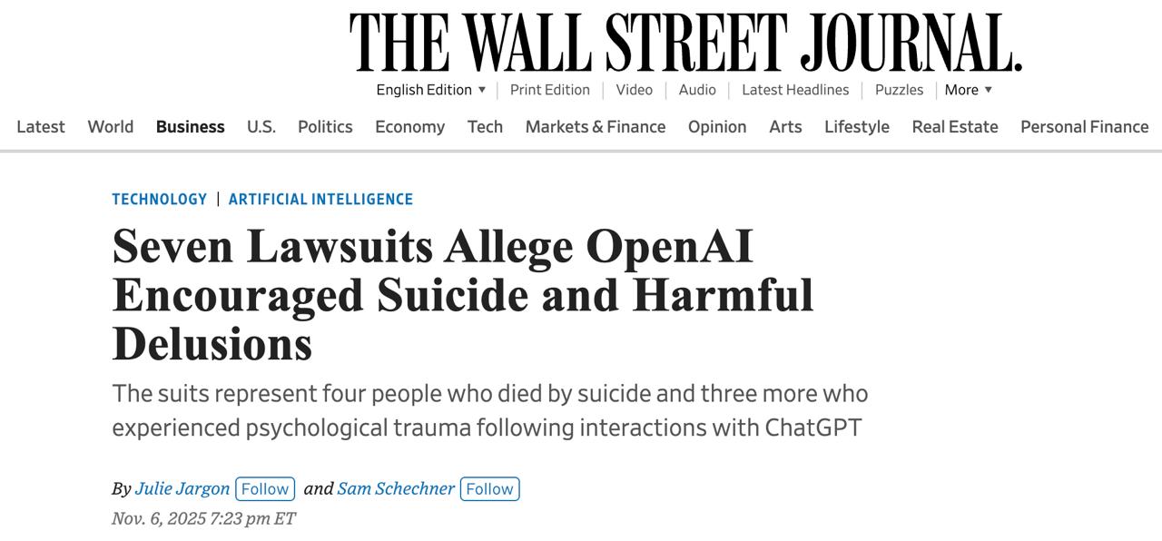 За інформацією видання, проти американської компанії розробника чат-бота OpenAI подано сім судових позовів представниками чотирьох осіб, які наклали на себе руки, і ще трьох, які отримали психологічну травму після взаємодії з ChatGPT.