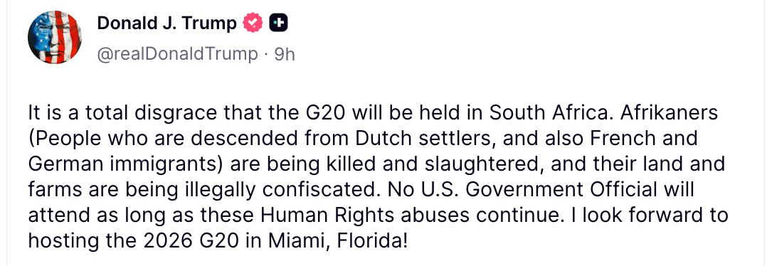 "Це повне ганьба, що саміт G20 проходитиме в Південній Африці. Африканери вбиваються і зазнають різанини, їхня земля і ферми незаконно конфіскуються", - сказав американський президент.