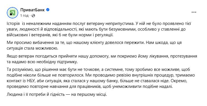 Нагадаємо, вчора ми розповідали, що у ветерана ЗСУ без рук і ніг у "ПриватБанку" зажадали "взяти платіжну картку в руки і потримати у особи для фото", щоб відновити виплати, які потрібно.