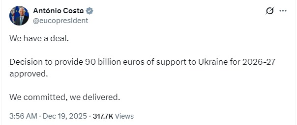 "Ми домовилися. Затверджено рішення щодо надання Україні підтримки у розмірі 90 мільярдів євро на 2026-2027 роки. Ми взяли на себе зобов'язання, ми їх виконали", - написав він.