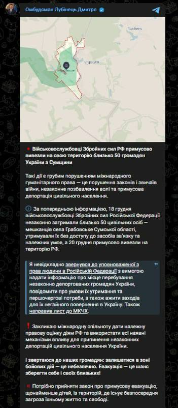 За його словами, після перетину кордону російські військові затримали близько 50 місцевих жителів, утримували їх без доступу до засобів зв'язку та належних умов, а потім примусово вивезли на територію Росії.
