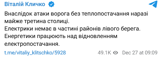 Внаслідок сьогоднішньої комбінованої атаки РФ на Київ майже третина міста залишилася без теплопостачання.