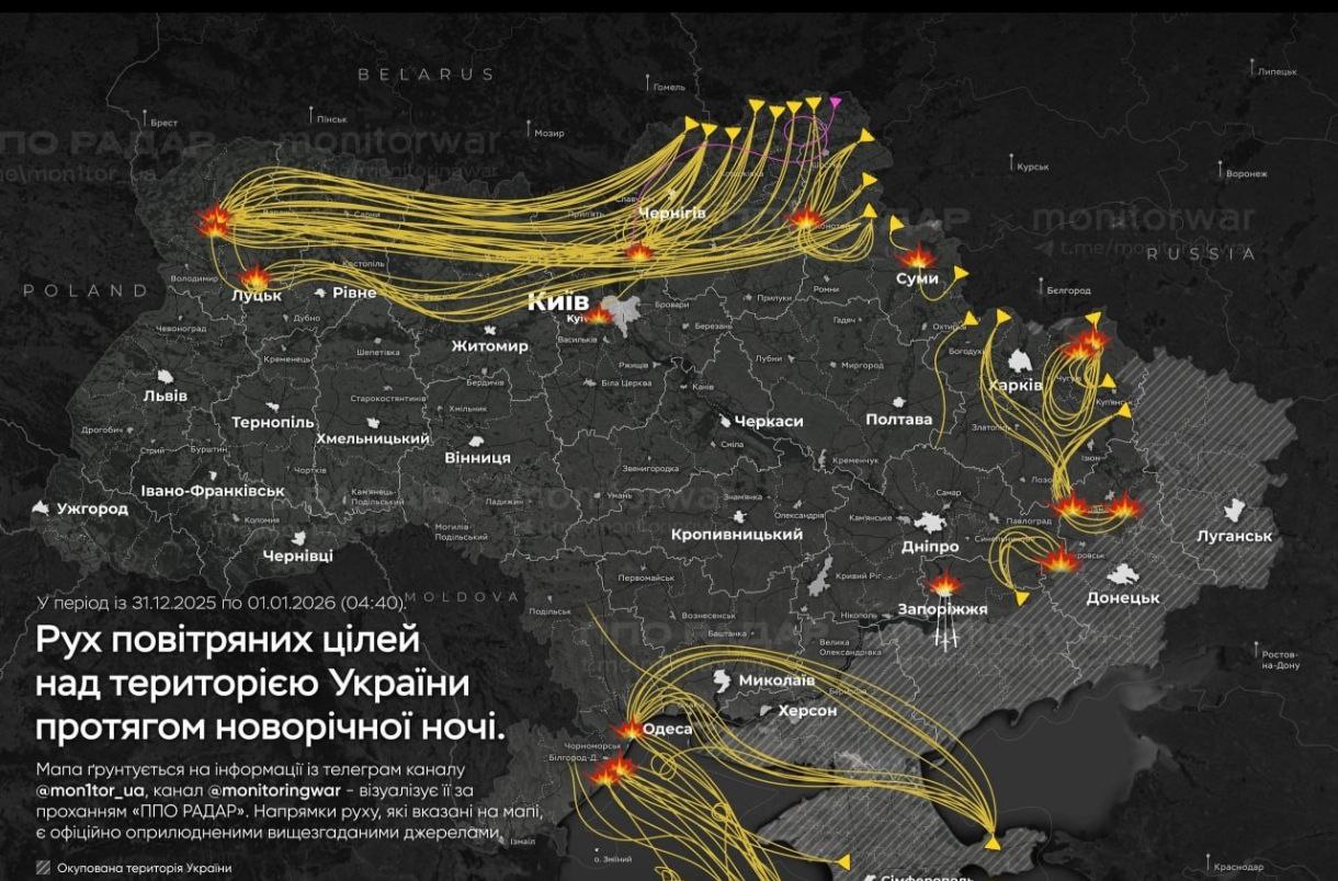 У новорічну ніч війська РФ запустили понад 200 дронів по Волинській, Рівненській, Запорізькій, Одеській, Сумській, Харківській та Чернігівській областях.