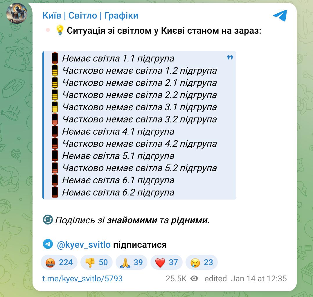За даними пабліків, зараз у всіх груп світла або немає взагалі, або є тільки у деяких абонентів.