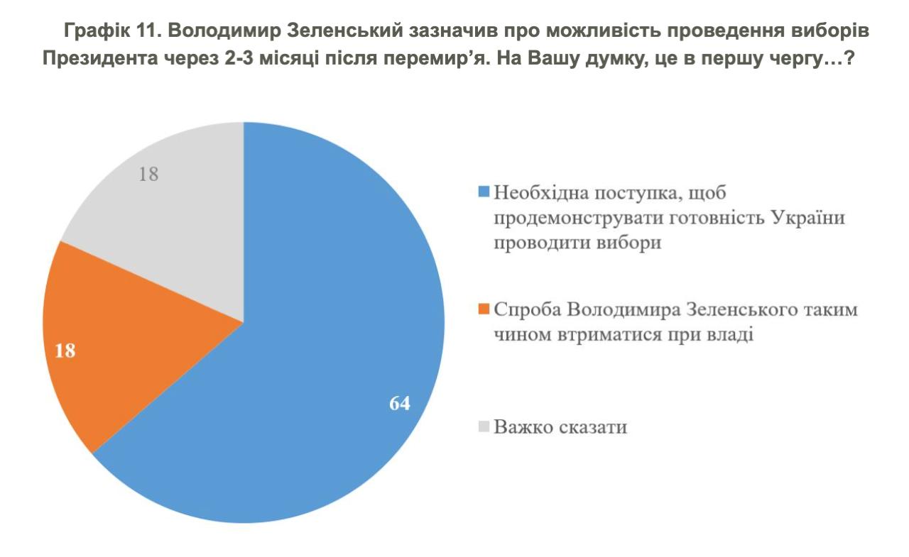 При цьому 64% респондентів переконані, що проведення президентських виборів через 2–3 місяці після можливого перемир'я є необхідним для демонстрації готовності України до виборчого процесу. Лише 18% опитаних розцінюють це як спробу чинного президента Володимира Зеленського утриматись при владі.