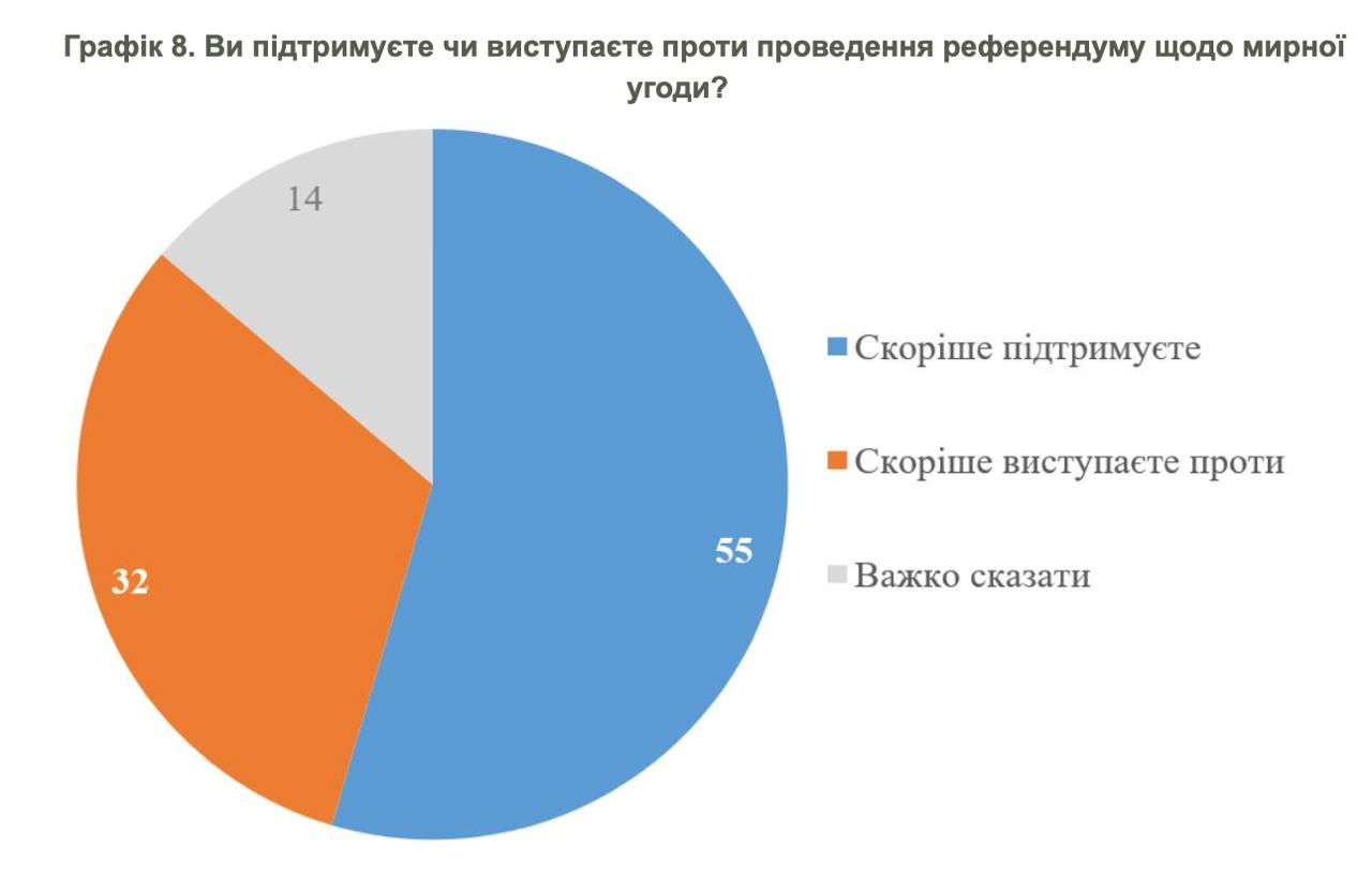 Також 55% підтримують проведення референдуму про мирну угоду, 32% – проти цього.