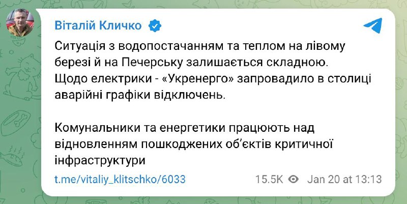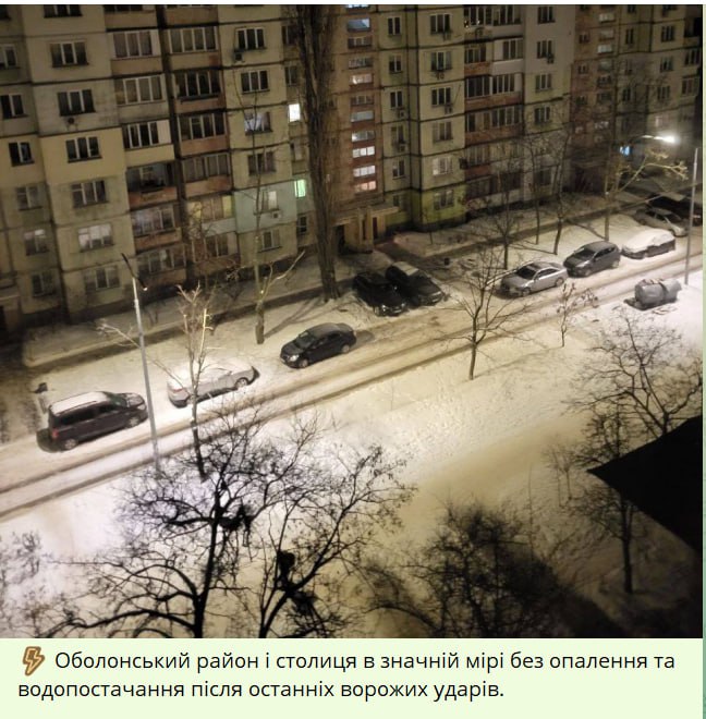 - у Києві без опалення залишилося понад 5600 багатоквартирних будинків - стільки ж, скільки після попереднього російського удару. Майже вся лівобережна частина міста без води, правому березі її немає у окремих районах. Також продовжуються відключення світла.