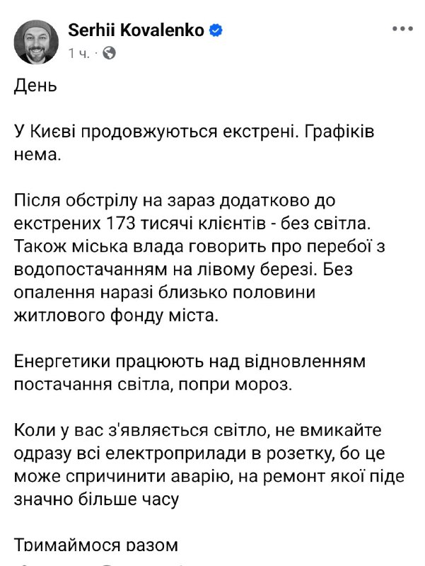 16.53 Про ситуацію на лівому березі Києва розповідає мешканець Позняків: "Світла, води та опалення немає. Батареї льодіють, і в квартирах холодно. А ще зник зв'язок. Голосовий зв'язок ще хвилями пробивається, а ось мобільного інтернету тотально немає. Хором із сусідами намагалися додзвонитися до "Київстару", але це неможливо Заявляючи, що немає вільних консультантів. Так уже кілька годин.