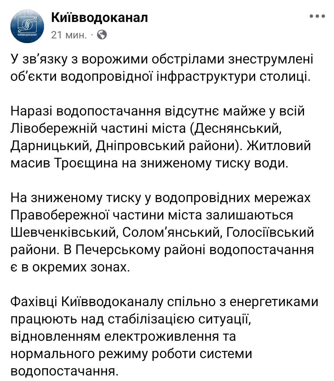 9.09 Після обстрілу у Києві без водопостачання залишилися Деснянський, Дарницький та Дніпровський райони, повідомили у міськводоканалі.