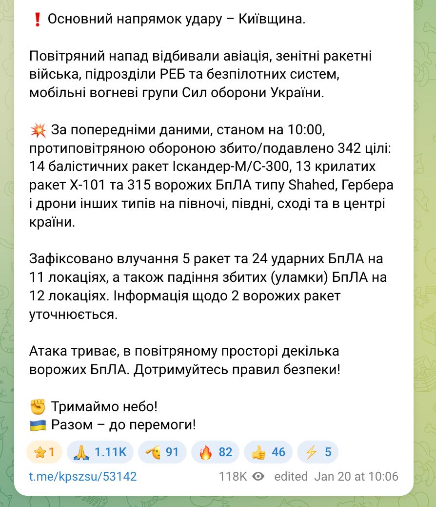 "Зафіксовано попадання 5 ракет та 24 ударних БПЛА на 11 локаціях, а також падіння збитих (уламки) БПЛА на 12 локаціях. Інформація про дві ворожі ракети уточнюється", - повідомляють ВС.