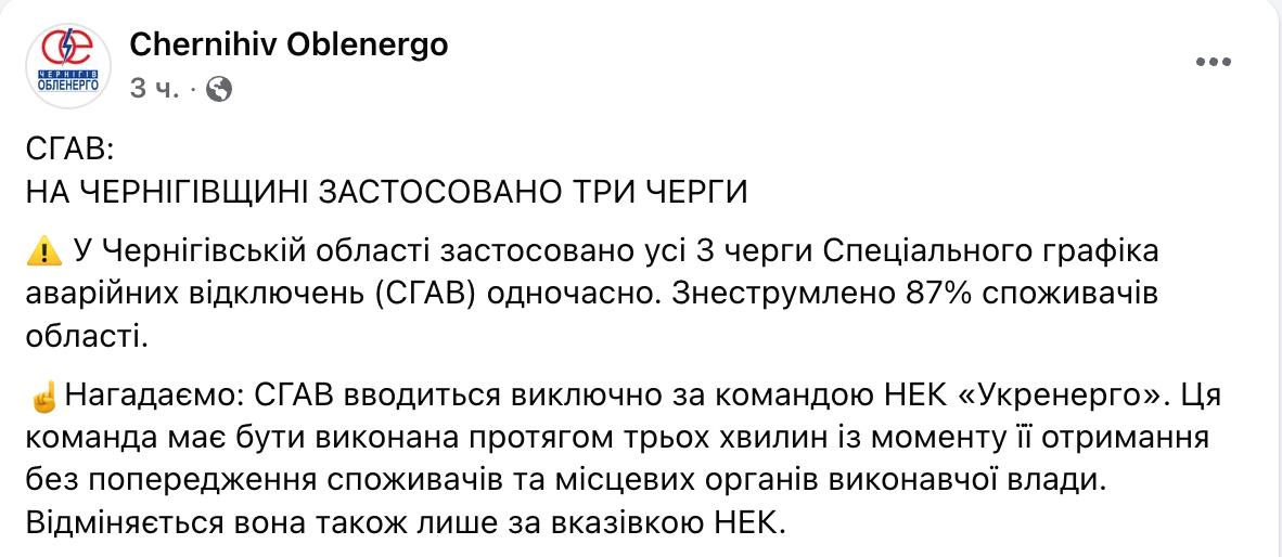 18.01 87% Чернігівської області без світла, повідомляє обленерго.