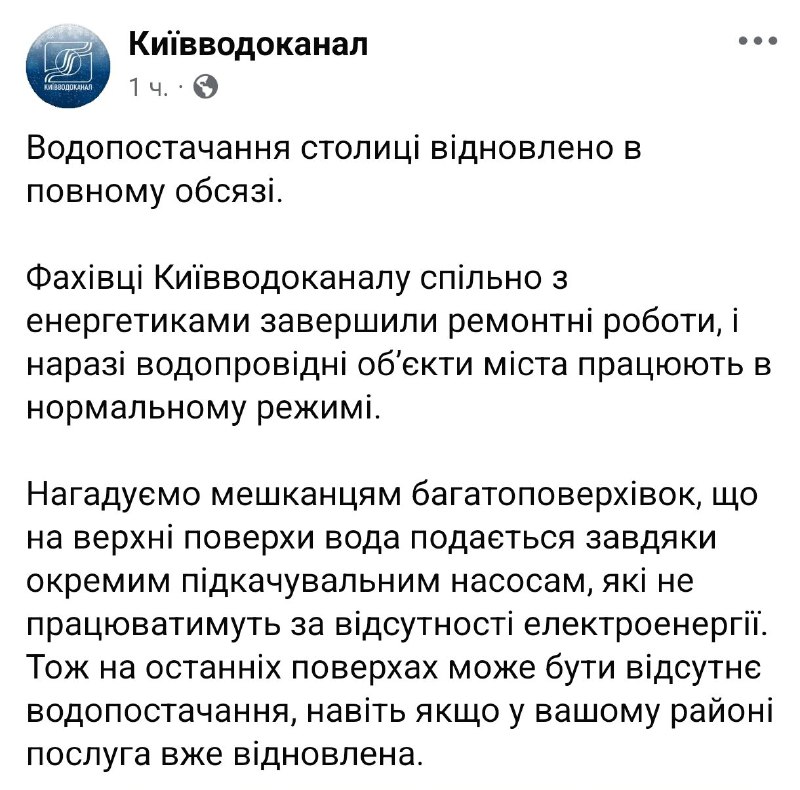 08:25 У Києві повернули водопостачання, яке пропадало після вчорашніх ударів. Про це повідомляє міський водоканал.