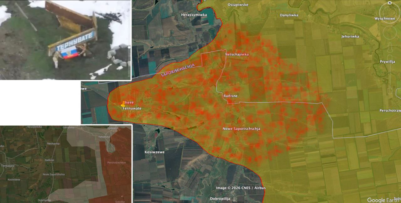 "Російська армія вторгнення захопила Тернувате у Запорізькій області, наголосивши, що попередні відео з прапорами з Нечаївки, Радісного та Нового Запоріжжя були не просто "прапорними трюками", а відображали територіальні поступи в цьому районі", - написав Рьопкє.