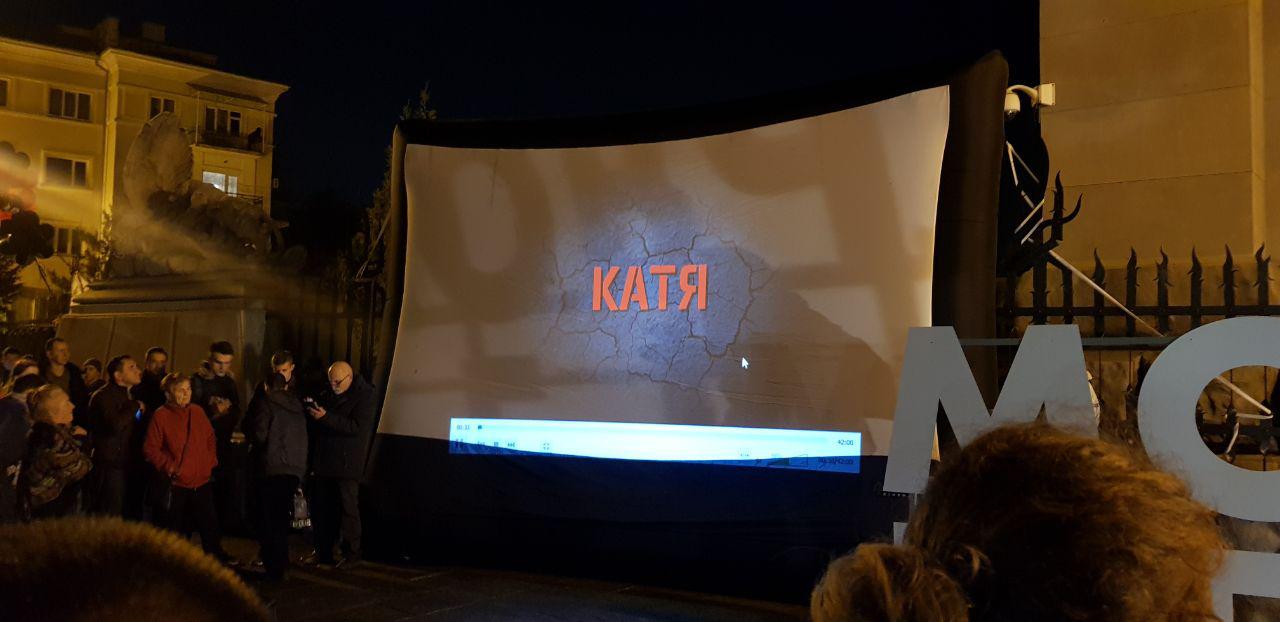 Также на экране транслировался небольшой ролик - хронология события происшествия с Катей Гандзюк. В то же время рядом с экраном установили металлическую конструкцию с надписью "Молчание убивает". Под металлоконструкцией "Молчание убивает" участники акции "Год без Кати" установили памятные лампады.