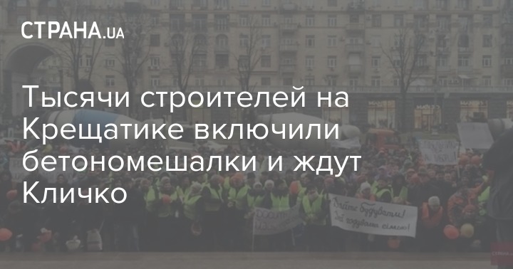 Около полутора тысяч строителей протестовали у здания Киевской городской госадминистрации утром во вторник. Как передает корреспондент "Страны", вдоль Крещатика в районе КГГА стоят два десятка работающих бетономешалок. Водители за рулем спецтехники сигналят и вращают емкости для бетона, участники митинга стучат строительными касками и кричат "Ганьба".